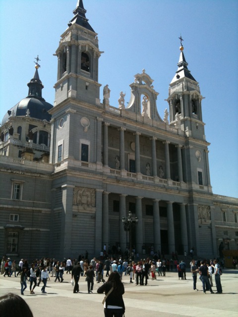 I had a rare opportunity to begin Holy Week in Espana. I went to Mass at the Cathedral de Santa Maria la Real de La Almudena in Madrid yesterday for Domingo de las Palmas Misa. In English that means I went to the Cathedral in Madrid for Palm Sunday Mass. I love architecture and history and this place has both. It took over 100 years to build the cathedral. It’s adjacent to the Royal Palace. It is apparently built over a Moorish mosque that was destroyed in 1085. As early as the 1500’s plans were discussed for building a cathedral in Madrid. Construction didn’t actually begin until 1879 and due to the Spanish Civil War the project was abandoned until the 1950’s. The cathedral is very modern in European terms – Pope John Paul II dedicated it in 1993. It has a Neo-Gothic interior and Neo-Romanesque crypt. It is an amazing structure. The way the light filled the space seemed truly divine.